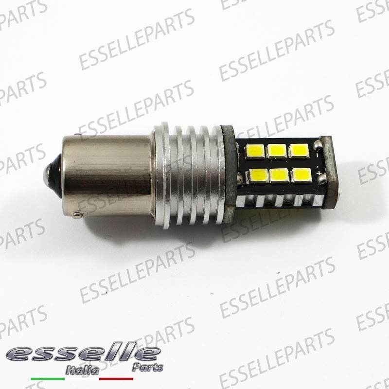 Lampada P21W BA15S 15 LED (non segna "errore" grazie ad una resistenza incorporata), i 15 LED SMD presenti nel bulbo permettono un' illuminazione laterale di 360° ed un' illuminazione frontale di 180°, illuminando in maniera omogenea tutta la parabola del faro. Le caratteristiche principali di questa lampada a led sono: L'altissima luminosità (circa 6 volte superiore alle luci classiche), la lunga durata ed il bassissimo consumo energetico, la colorazione bianco ghiaccio.
