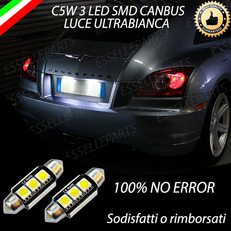 Coppia luci targa 3 LED Siluro C5W CANBUS luce bianco ghiaccio 6000K, non segnano "errore" sul quadro strumenti grazie ad una doppia resistenza integrata. I 3 led SMD presenti nel bulbo permettono un illuminazione laterale di 360° ed un illuminazione frontale di 180°, garantendo un illuminazione 2 volte superiore rispetto alle normali lampade alogene ed una luce bianco ghiaccio come le auto di ultima generazione.