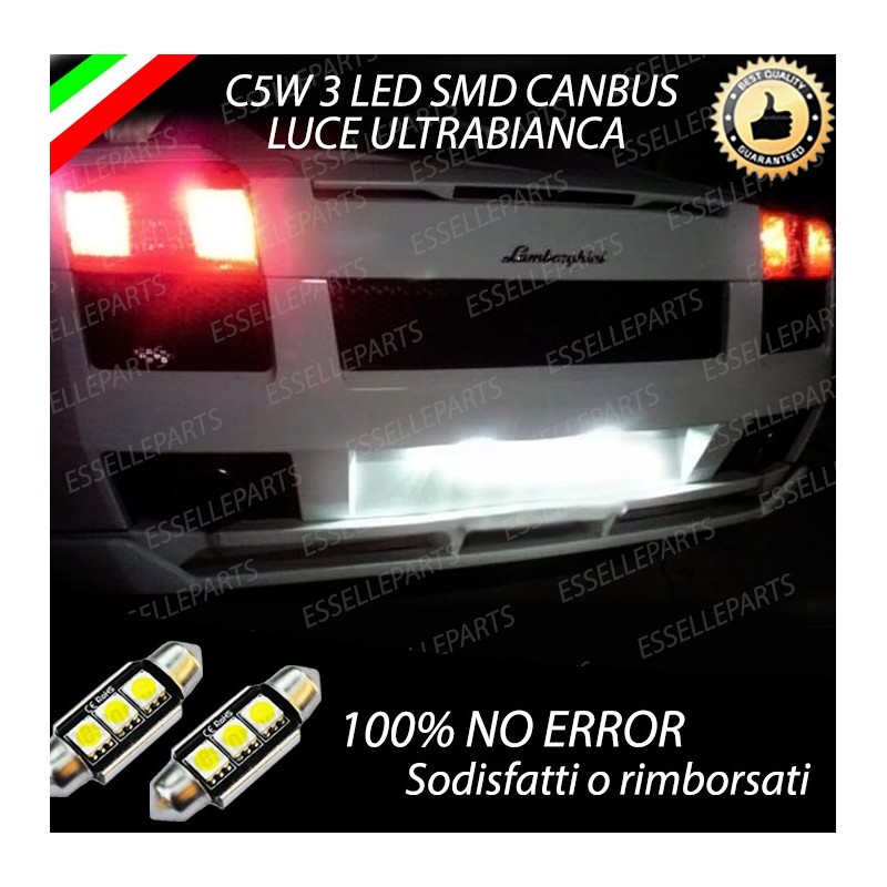 Coppia luci targa 3 LED Siluro C5W CANBUS luce bianco ghiaccio 6000K, non segnano "errore" sul quadro strumenti grazie ad una doppia resistenza integrata. I 3 led SMD presenti nel bulbo permettono un illuminazione laterale di 360° ed un illuminazione frontale di 180°, garantendo un illuminazione 2 volte superiore rispetto alle normali lampade alogene ed una luce bianco ghiaccio come le auto di ultima generazione.
