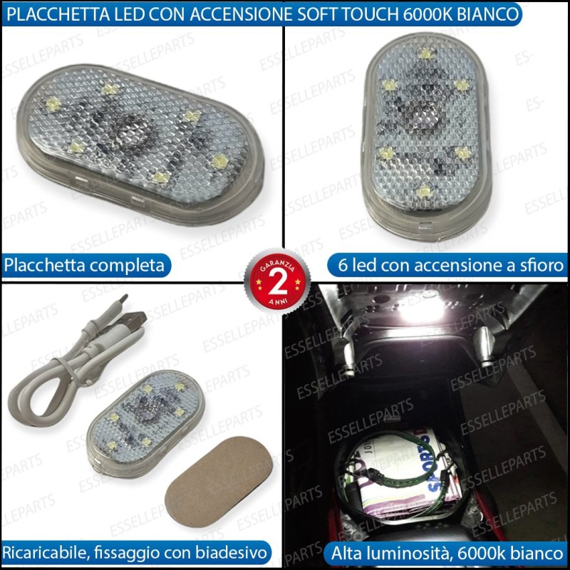 Placchetta completa specifica per sottosella, composta da 6 led ad alta luminosità che garantiscono una perfetta illuminazione soprattutto di notte, utile per riporre oggetti o per illuminare il vano in caso di scarsa luminosità. Il montaggio avviene senza modifiche in quanto la placchetta si fissa tramite il biadesivo ad alta resistenza in dotazione, inoltre è dotata di una batteria integrata da 120 mAh che garantisce un utilizzo continuativo di 1,5 ore, con un tempo di ricarica di circa 30 minuti con il cavo anch'esso dotazione.