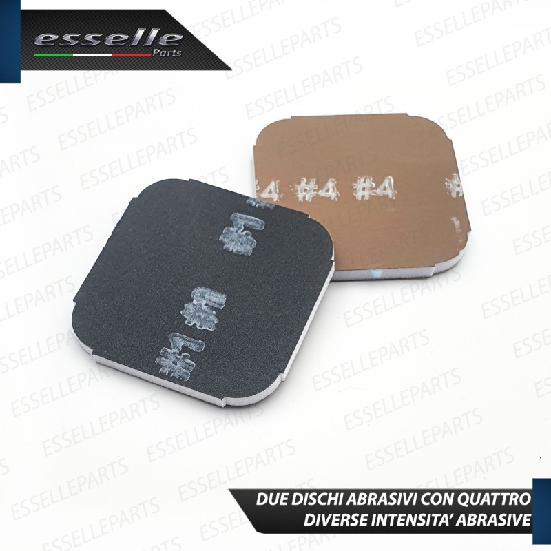 Il Kit è composto da: Polish elimina graffi, due dischi abrasivi con 4 livelli di abrasività extra fine, un panno in microfibra ed un Lucidante spray per il ripristino dei fari opachi.
