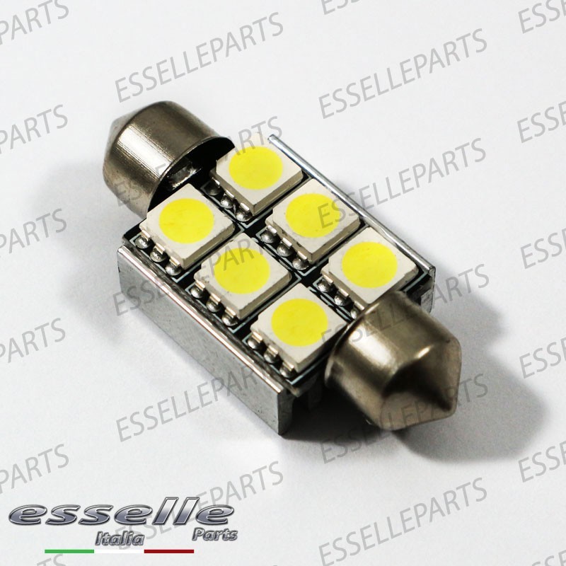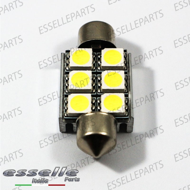 Coppia luci targa 6 LED Siluro C5W CANBUS luce bianco ghiaccio 6000K, non segnano "errore" sul quadro strumenti grazie ad una doppia resistenza integrata. I 6 led SMD presenti nel bulbo permettono un illuminazione laterale di 360° ed un illuminazione frontale di 180°, garantendo un illuminazione 2 volte superiore rispetto alle normali lampade alogene ed una luce bianco ghiaccio come le auto di ultima generazione.
