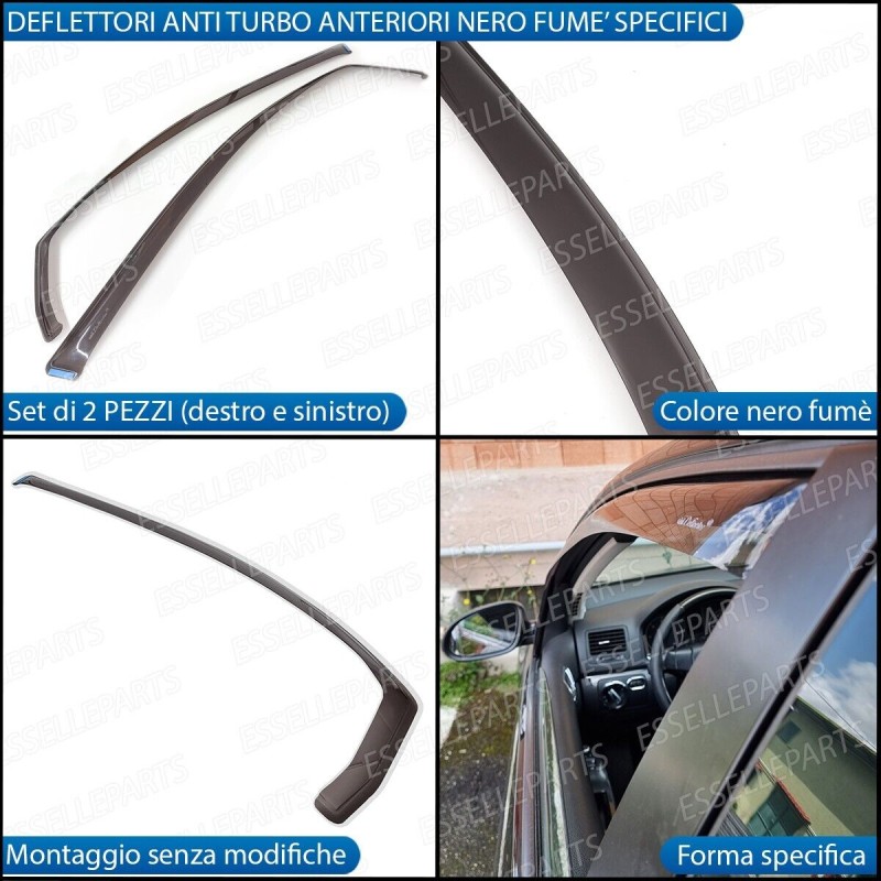 In polimetilmetacrilato antiurto resistente con una colorazione nero fume' trasparente questi deflettori seguiranno perfettamente le forme dell'auto in quanto specifici, il montaggio non richiede modifiche o altro, in quanto avviene ad incastro e potra' essere seguito in autonomia grazie alle istruzioni che riceverete unitamente ai due deflettori per le portiere anteriori.